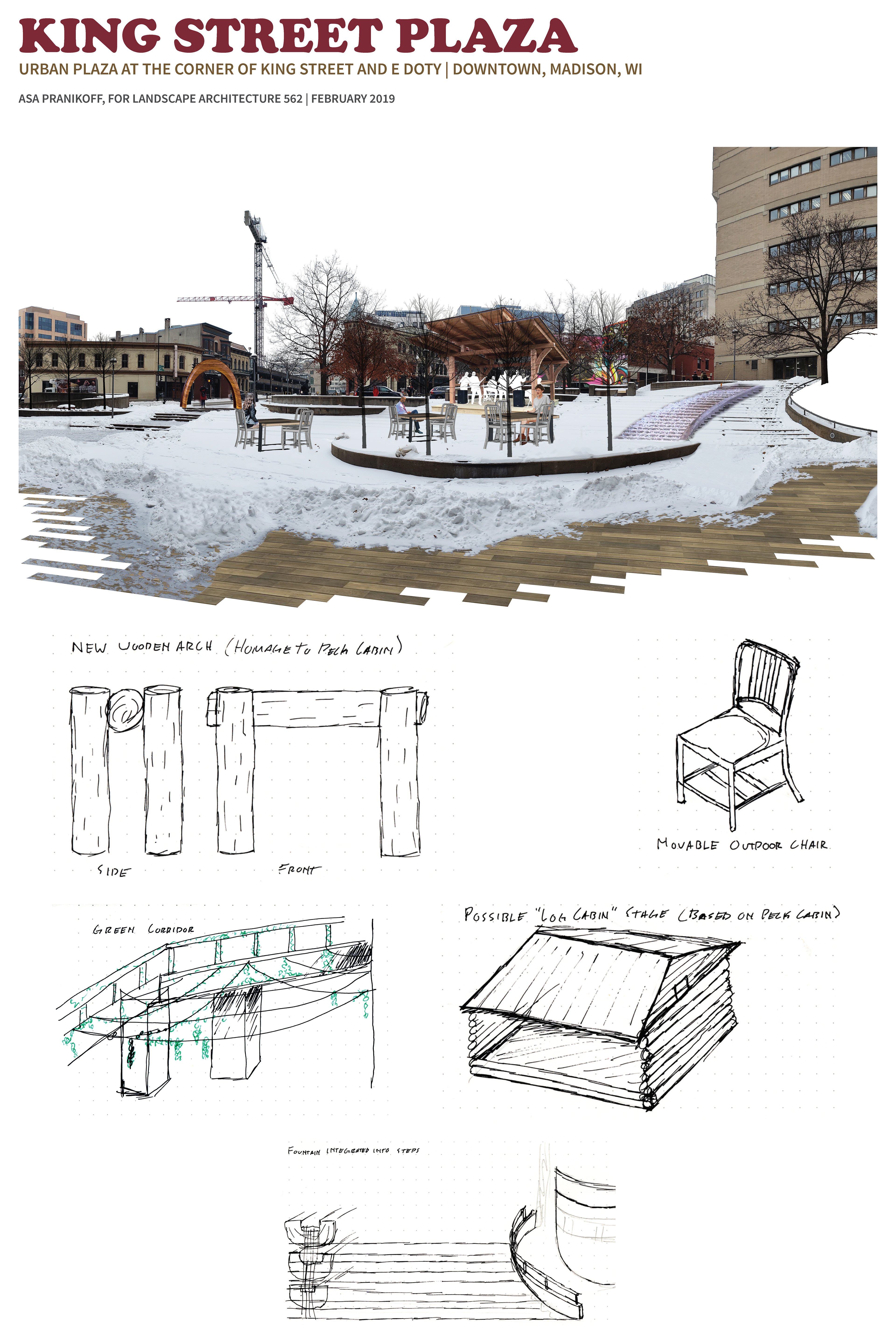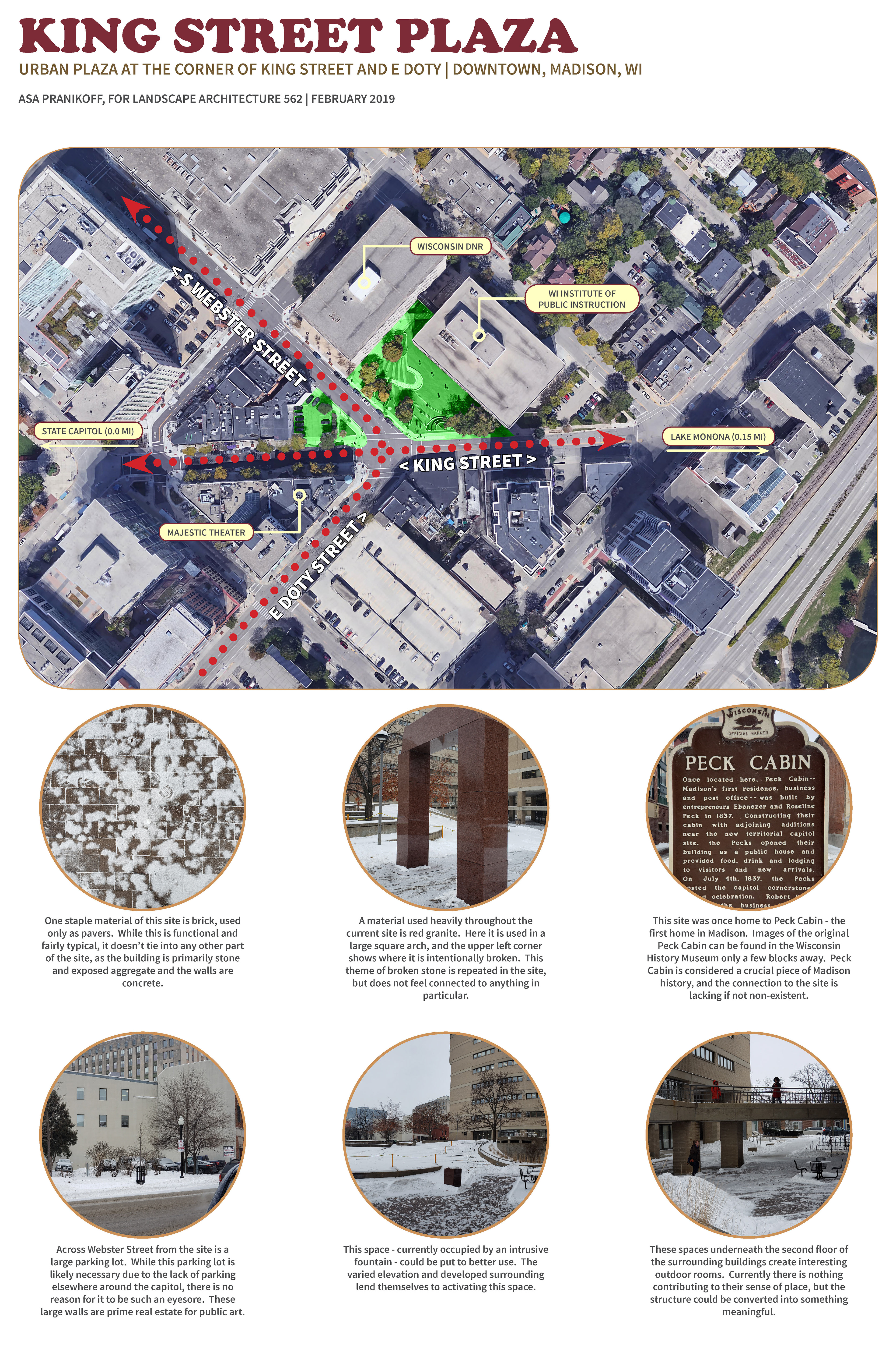 The purpose of this project is to evaluate an existing open space and offer improvements or alternatives to the existing design. This site is located just East of Wisconsin's capitol in a fairly highly trafficked area.